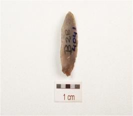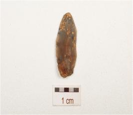 | Description / विवरण | A chert blade with prominent mid ridge on dorsal, triangular in section, diffused bulb on ventral and use wear marks on cutting edge. |