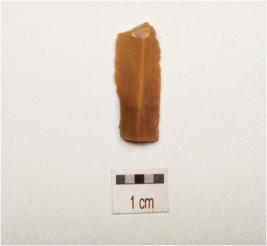 | Description / विवरण | Fragment of parallel sided chert blade with prominent mid ridge on dorsal, triangular in section, use wear marks on cutting edge and broken along both ends. |