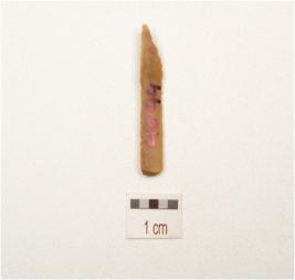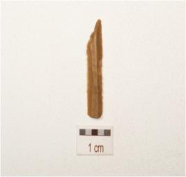 | Description / विवरण | A chert point with double ridge on dorsal, trapezoidal in section, use wear marks on cutting edge, pointed towards distal end and broken along proximal end. |