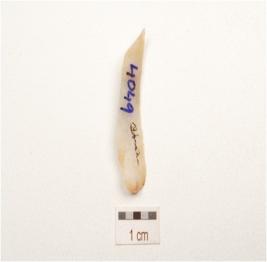 | Description / विवरण | A blade made on chalcedony with improminent double ridge on dorsal, diffused bulb on ventral and use wear marks on cutting edge. |