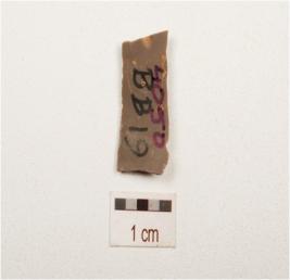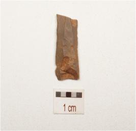 | Description / विवरण | Fragment of parallel sided chert blade with double ridge on dorsal, trapezoidal section, use wear marks on cutting edge and broken along both ends. |