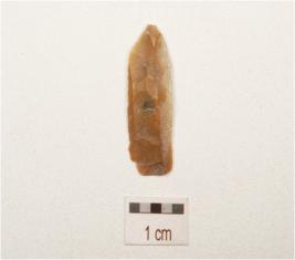 | Description / विवरण | A chert blade with double ridge on dorsal, trapezoidal in section, diffused bulb on ventral and use wear marks on cutting edge. |