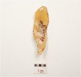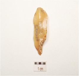 | Description / विवरण | A chalcedony blade with mid ridge on dorsal, cortex visible on distal end, triangular in section bulb on ventral and use wear marks on cutting edge. |