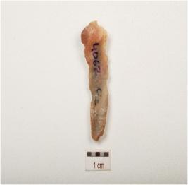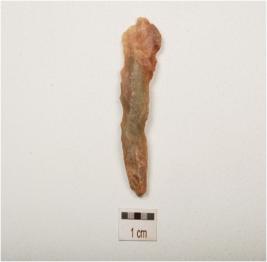 | Description / विवरण | A chalcedony blade with double ridge on dorsal, trapezoidal section, bulb on ventral and use wear marks on cutting edge. |