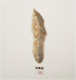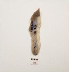 | Description / विवरण | A chalcedony blade with improminent mid ridge on dorsal, bulb on ventral , triangular section and use wear marks on cutting edge. |