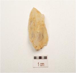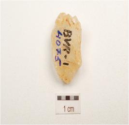 | Description / विवरण | A utilized flake made on quartz with flake scars on surface and use wear marks on edges. |