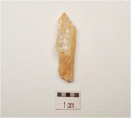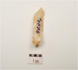 | Description / विवरण | A quartz blade with single ridge on dorsal, triangular section and use wear marks on cutting edge. |