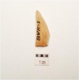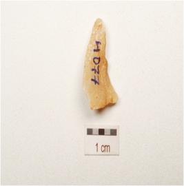 | Description / विवरण | A utilized flake made on quartz with single ridge and cortex on dorsal, triangular section and use wear marks on edges. |