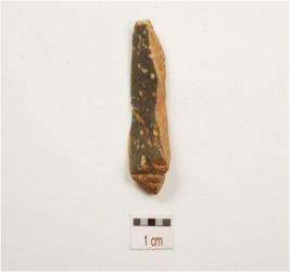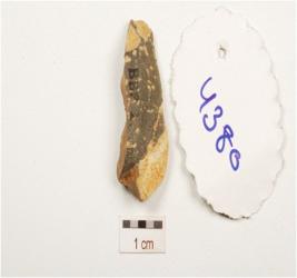 | Description / विवरण | A flake made on chert, prepared platform, flake scars on surface and prominent bulb on ventral side. |