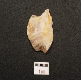 | Description / विवरण | A scraper made on quartz , use wear marks along the working edge, flake scars on dorsal side, prominent bulb on ventral side and prepared platform. |