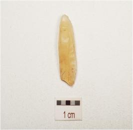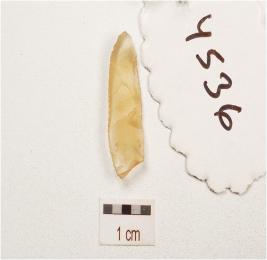 | Description / विवरण | A flake made on chalcedony, blad scars on dorsal side and use wear marks along cutting edge. |