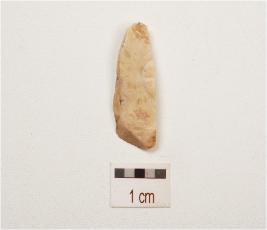 | Description / विवरण | A flake made on chert, flake scars on surface and use wear marks along cutting edge. |