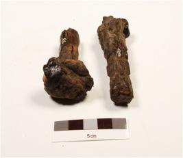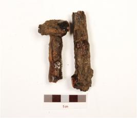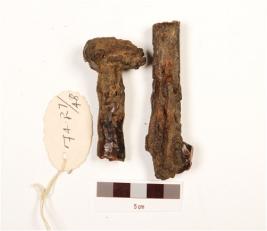 | Description / विवरण | Fragment of a iron nail, broken into two pieces, uneven surface and circular head. |