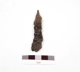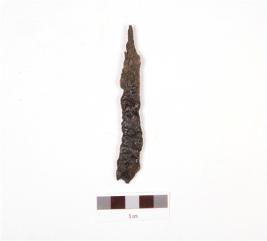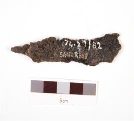 | Description / विवरण | A iron arrowhead, uneven surface and edges, rusted and short tang. |