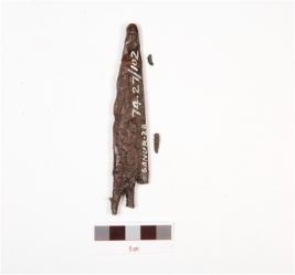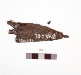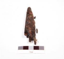 | Description / विवरण | Iron arrowhead, pointed top and barbed, broken tang and rough surface. |