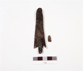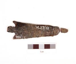 | Description / विवरण | A iron arrowhead, U shaped top, broken tang, pointed barb, rusted and rough surface. |