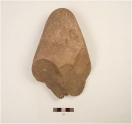 | Description / विवरण | Chopper made on quartzite pebble, unifacial with flake scars, one side flake scars, wavy cutting edges, butt end on posterior, ovate section. |