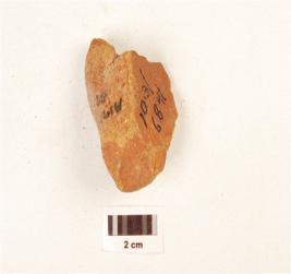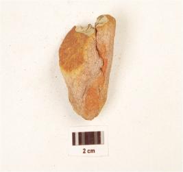 | Description / विवरण | A miniature hand axe made on sandstone pebble, cracks on the surface, broken at proximal end, plano convex section. |