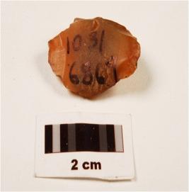 | Description / विवरण | A chalcedony side scraper made on end struck flake, flake scars on both sides, smooth surface. |