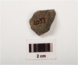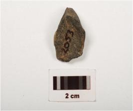 | Description / विवरण | A stone flake with cortex, flake scars and smooth surface, dark grey in colour. |