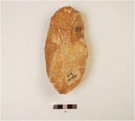 | Description / विवरण | A quartzite hand axe made on side struck flake, flake scars on the surface, platform on the proximal end bulb missing, plano convex-cross section, wavy cutting edges. |