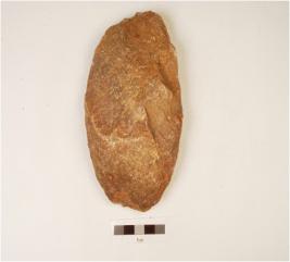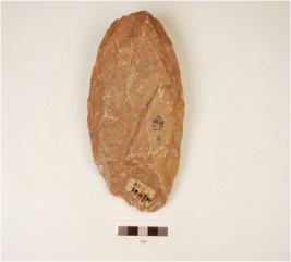 | Description / विवरण | A quartzite hand axe made on flake, flake scars on the surface, plano convex cross section, wavy cutting edges. |