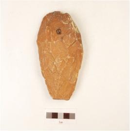 | Description / विवरण | A quartzite hand axe made on side struck flake, flake scars on the surface, platform on the proximal end, bi convex cross section, wavy cutting edges. |