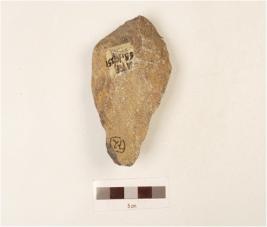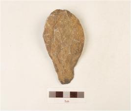 | Description / विवरण | A quartzite hand axe made on end struck flake, flake scars on the surface, bifacial, biconvex-cross section, wavy cutting edges. |