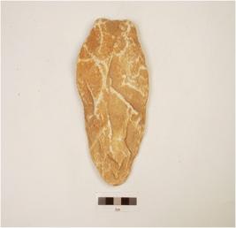 | Description / विवरण | A quartzite hand axe made on flake, flake scars on the surface, unifacial, plano convex cross section, wavy cutting edges. |