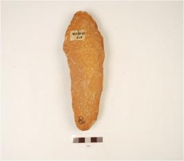 | Description / विवरण | A quartzite hand axe made on flake, flake scars on the surface, unifacial, plano convex cross section, wavy cutting edges. |