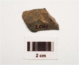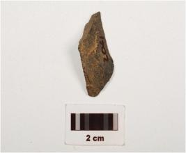 | Description / विवरण | A basalt stone flake with flake scars, smooth surface and use wear marks on edges. |