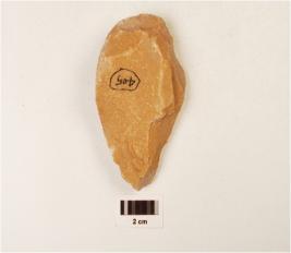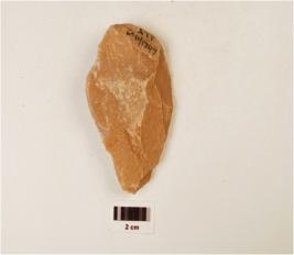 | Description / विवरण | A quartzite miniature hand axe made on flake, flake scars on the surface, bi convex cross section, use wear marks on the surface, pear shaped. |