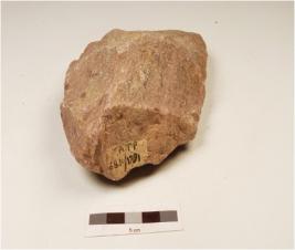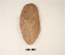 | Description / विवरण | A quartzite hand axe made on side struck flake, flake scars on the surface, prepared platform on the proximal end, plano convex cross section, wavy cutting edges. |