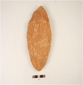 | Description / विवरण | A quartzite hand axe made on flake, flake scars on the surface, plano-convex-cross section, wavy cutting edges. |
