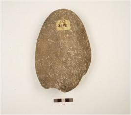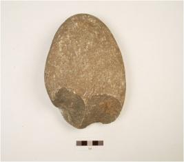 | Description / विवरण | A chopper tool made on a pebble, flake scars at anterior end, cortex at posterior butt end, rough surface, round and flat shaped biconvex section. |