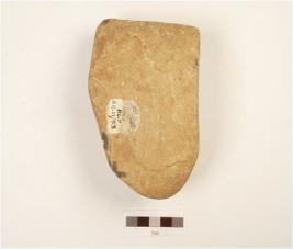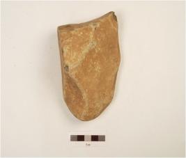 | Description / विवरण | Chopper made on quartzite pebble, one side flake, blunted cutting edge, butt end on posterior end, cutting edge on anterior end, trangular section. |