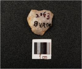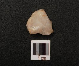 | Description / विवरण | A quartz end struck flake with flake scars on surface, prepared platform, diffused bulb on ventral and use-wear marks on edges. |