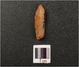 | Description / विवरण | A quartz blade with prominent mid ridge and cortex on surface, triangular section, use-wear marks on cutting edge and broken along distal end. |