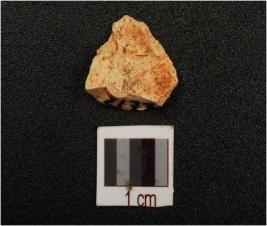 | Description / विवरण | A chert end struck flake with improminent ridge on dorsal, prepared platform, bulb on ventral and use-wear marks on edges. |