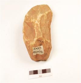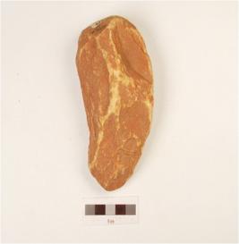 | Description / विवरण | A sandstone hand axe made on pebble, cortex visible at butt end, flake scars on both sides. |