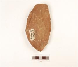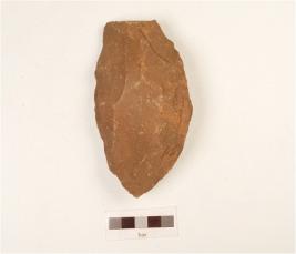 | Description / विवरण | A hand axe made on quartzite pebble, small flake scars on both sides biconvex section, preapred platform at proximal end. |