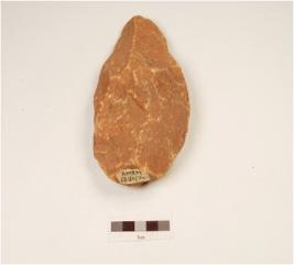 | Description / विवरण | A bifacial handaxe made on quartzite end struck flake with flake scars on both sides, prepared platform, blunt working edge and triangular in section, pointed along other end. |