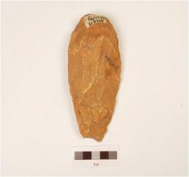 | Description / विवरण | A bifacial handaxe made on quartzite flake with flake scars on dorsal, wavy working edge and triangualr in section, thick butt end and pointed on other end. |