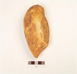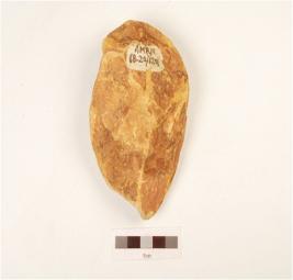 | Description / विवरण | A bifacial handaxe, made on sandstone flake with flake scars on both sides, broken pointed end and triangular in section. |