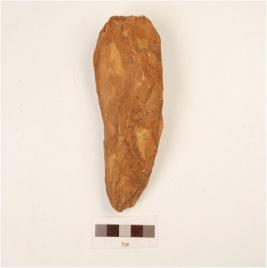 | Description / विवरण | A bifacial handaxe made on quartzite flake with flake scars on both sides sharp working edge and triangualr in section, thick butt end and pointed on other end. |