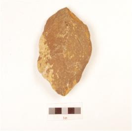 | Description / विवरण | A hand axe made on quartzite pebble, flake scars on both sides, biconvex section. |
