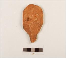| Description / विवरण | A hand axe made on quartzite end struck flake, preapred platform on proximal end, flake scars on surface, pointed end. |