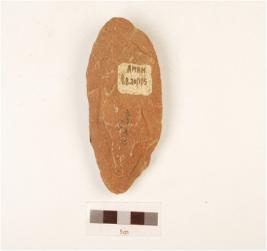 | Description / विवरण | A hand axe made on quartzite side struck flake, use wear cutting edges, flake scars on surface, plano convex in section. |