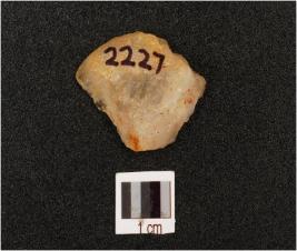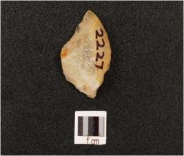 | Description / विवरण | Side scraper made on quartz with sharp working edge, use ware marks along the working edge, cortex visible on one side, defused bulb visible near working edge, |