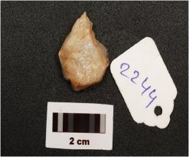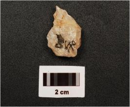 | Description / विवरण | Quartz flake with prepared platform, diffused bulb on ventral side, flake scars of dorsal side, use wear mark along cutting edges, |